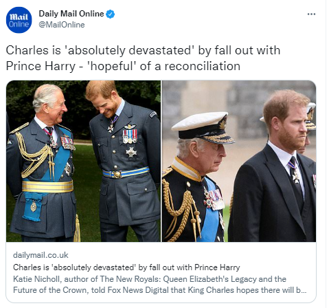 ادعى أحد الخبراء الملكيين أن الملك تشارلز الثالث ملك بريطانيا، “يشعر بالدمار التام” بسبب ما حدث مع الأمير هارى، وأنه يأمل فى المصالحة، حيث قالت كاتي نيكول، مؤلفة كتاب The New Royals: Queen Elizabeth’s Legacy and the Future of the Crown ، لـ Fox News Digita l إن الملك يشعر بالحزن بسبب تغير علاقته مع دوق ساسكس، 38 عاماً، منذ زواجه من ميجان ماركل.
