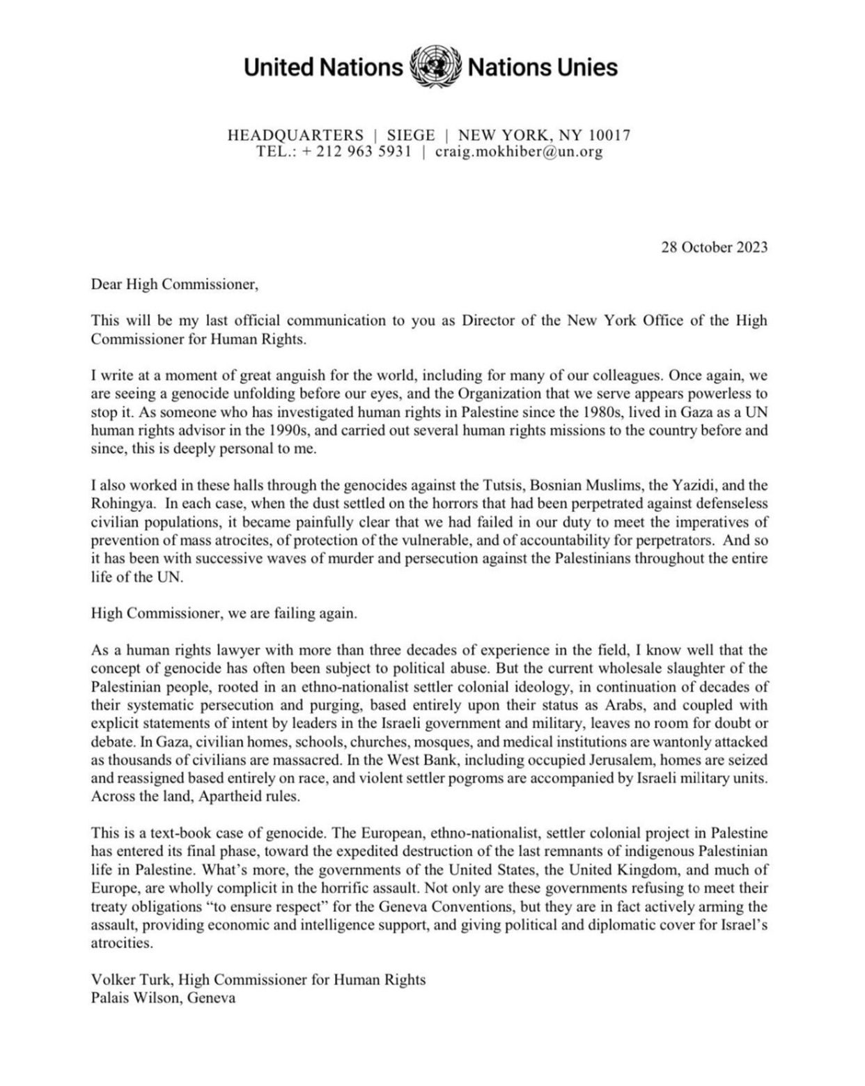 إستقال مدير مكتب كريج مخيبر مدير مكتب نيويورك للمفوضية السامية لحقوق الإنسان بالأمم المتحدة يوم السبت ٢٨ أكتوبر الماضي من منصبه عبر خطاب خطاب رسمي موجه من مكتبه للمفوض السامي لحقوق الإنسان في الأمم المتحدة النمساوي فولكر تورك بسبب الابادة الجماعية التي يتعرض لها الشعب العربي الفلسطيني في غزة .