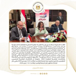 1- استهلت السفيرة سها جندي وزيرة الهجرة، جولاتها الخارجية لتحفيز المصريين بالخارج على المشاركة في الانتخابات الرئاسية 2024، بزيارة المملكة العربية السعودية، و استقبلها السفير طارق المليجي قنصل مصر في الرياض. وأكدت وزيرة الهجرة على أهمية الحفاظ على المكتسبات الدستورية لأبنائنا بالخارج، وفي مقدمتها حق المشاركة في الانتخابات والاستحقاقات الدستورية، وهو الحق الذي أصلته الجمهورية الجديدة، وتابعت أن اختيار المملكة العربية السعودية لبداية حملة التوعية المباشرة للمواطنين بالخارج، يأتي كونها تضم الجالية الأكبر من المصريين بالخارج حول العالم، فضلا عن استعراض آخر التطورات الجارية لتأسيس الشركة الاستثمارية للمصريين بالخارج، وأبرز المحفزات الاستثمارية التي أتاحتها الدولة المصرية لتشجيع المستثمرين وجذب رؤوس الأموال.