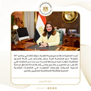 12- أجرت السفيرة سها جندي وزيرة الهجرة، حوارًا خاصًا في برنامج “90 دقيقة” مع الإعلامية هبة جلال والمذاع على قناة المحور الفضائية، تناولت فيه سيادتها الحديث عن عدد من الملفات التي تشغل بال المصريين بالخارج، وعلى رأسها إعادة إطلاق مبادرة استيراد السيارات وإجراءات التصويت في الانتخابات الرئاسية المصرية والشركة الاستثمارية للمصريين بالخارج.