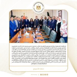 8- استقبلت السفيرة سها جندي وزيرة الهجرة، النائب محمود حسين رئيس اتحاد شباب المصريين بالخارج، ورئيس لجنة الشباب والرياضة بمجلس النواب، والنائب سيد سمير، عضو مجلس النواب نائب رئيس اتحاد شباب المصريين بالخارج، وعدد من أعضاء مجلس إدارة الاتحاد من الشباب، وذلك بحضور النائب طارق رضوان، رئيس لجنة حقوق الإنسان بمجلس النواب. وأشادت الوزيرة بالجهد المبذول من الاتحاد في أغلب دول العالم لتقديم الخدمات المصريين بالخارج، مشيرة إلى أن الدولة المصرية تواجه العديد من التحديات، والتي تتطلب توحيد الصفوف بين المصريين والتكاتف سويا للمرور من هذه المرحلة، وتابعت قائلة: “إننا مقبلين على الانتخابات الرئاسية 2024، ومن المهم التأكيد خلال هذه الفترة على أهمية مشاركة المصريين في الخارج في هذا الاستحقاق”، لافتة إلى أن وزارة الهجرة تتابع مع الجاليات المصرية بالخارج آرائهم وأفكارهم للتعرف على التحديات التي تواجههم، ومن ثم يتم التغلب عليها وتذليلها لتشجيعهم على المشاركة والإدلاء بأصواتهم.