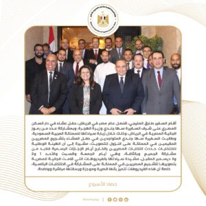4- التقت السفيرة سها جندي وزيرة الهجرة، الجالية المصرية بالعاصمة السعودية الرياض وذلك ضمن حملة “شارك بصوتك” لتحفيز المصريين بالخارج على المشاركة في الانتخابات الرئاسية 2024، وكذلك الترويج للاستثمار في مصر. واستهلت السفيرة سها جندي اللقاء بالإشادة بجهود السادة سفراء مصر بالخارج لخدمة أبنائنا حول العالم، كما ثمنت حرص المصريين بالخارج على المشاركة في الفعاليات والحضور من أماكن بعيدة، بجانب حرصهم على المشاركة في مختلف اللقاءات الافتراضية، والتي عقدتها الوزارة، ضمن مبادرة “ساعة مع الوزيرة”، لتشجيع المصريين بالخارج على المشاركة بالانتخابات الرئاسية المقبلة ٢٠٢٤ مضيفة أن الانتخابات الرئاسية للمصريين المقيمين بالخارج ستجرى أيام الجمعة والسبت والأحد 1،2،3 ديسمبر 2023، وفي حال الإعادة ستكون أيام الجمعة والسبت والأحد 5، 6، 7 يناير 2024.