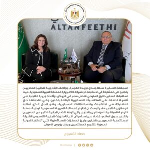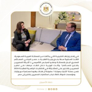 2- في إطار زيارتها الخارجية التي بدأتها من المملكة العربية السعودية، التقت السفيرة سها جندي وزيرة الهجرة، د. حسن الجراحي، المستثمر المصري البارز بالمملكة وعضو المجلس التأسيسي لـ”شركة المصريين بالخارج للاستثمار”. وأكدت الوزيرة خلال اللقاء حرصها على تحفيز المصريين بالخارج على المشاركة في الانتخابات الرئاسية المقبلة 2024 ضمن حملة “شارك بصوتك”، مضيفة أن هناك جهودا مستمرة مع وزارات ومؤسسات الدولة، كافة، لجذب استثمارات المصريين بالخارج إلى مصر.