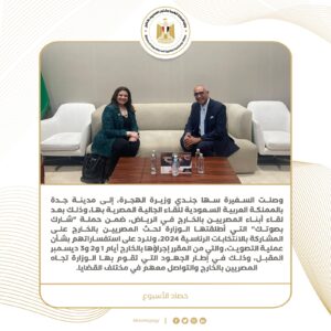 5- وصلت السفيرة سها جندي وزيرة الهجرة، إلى مدينة جدة بالمملكة العربية السعودية للقاء الجالية المصرية بها، وذلك بعد لقاء أبناء المصريين بالخارج في الرياض، ضمن حملة “شارك بصوتك” التي أطلقتها الوزارة لحث المصريين بالخارج على المشاركة بالانتخابات الرئاسية ٢٠٢٤، وللرد على استفساراتهم بشأن عملية التصويت، والتي من المقرر إجراؤها بالخارج أيام 1 و2 و3 ديسمبر المقبل، وذلك في إطار الجهود التي تقوم بها الوزارة تجاه المصريين بالخارج والتواصل معهم في مختلف القضايا.