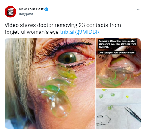كتبت كاترينا: “واقعة نادرة أن ينسى شخص ما إزالة العدسات اللاصقة ليلاً ويستمر في وضع واحدة جديدة كل صباح، 23 يوما على التوالى”، وأضافت الطبيبة بعد أن أعربت عن دهشتها من أكثر من مليون مشاهدة أنتجها مقطع الفيديو الخاص بها: “أن العدسات تم لصقهما معًا بشكل أساسي بعد بقائها تحت الجفن لمدة شهر”.