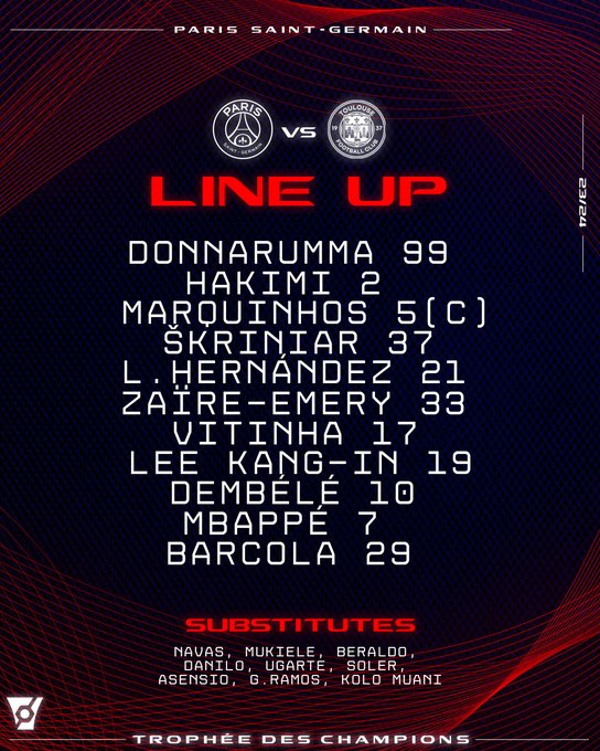 أعلن لويس إنريكي، المدير الفنى لفريق باريس سان جيرمان، عن تشكيل مواجهة نظيره تولوز، المقرر لها فى تمام العاشرة إلا الربع من مساء اليوم الأربعاء، على ملعب “حديقة الأمراء”، فى الصراع على لقب كأس السوبر الفرنسي.