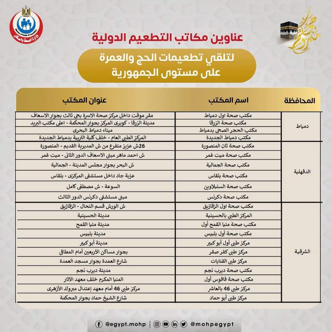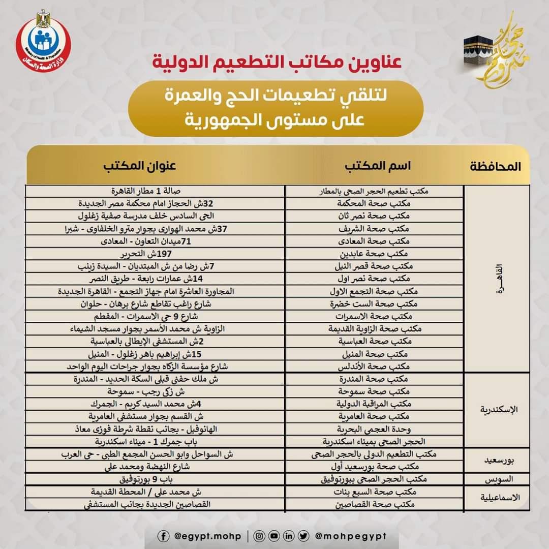 وتقدم وزارة الصحة التطعيمات المطلوبة والموصى بها قبل السفر لأداء العمرة أو فريضة الحج من خلال 160 مكتبا للتطعيمات الدولية وتطعيمات الحج والعمرة موزعة على كافة المحافظات، ويمكن الاستعلام عن مكاتب الصحة التي توفر خدمات التطعيم للمسافرين من خلال الاتصال برقم الخط الساخن لوزارة الصحة والسكان (105) أو الموقع الرسمي للوزارة.