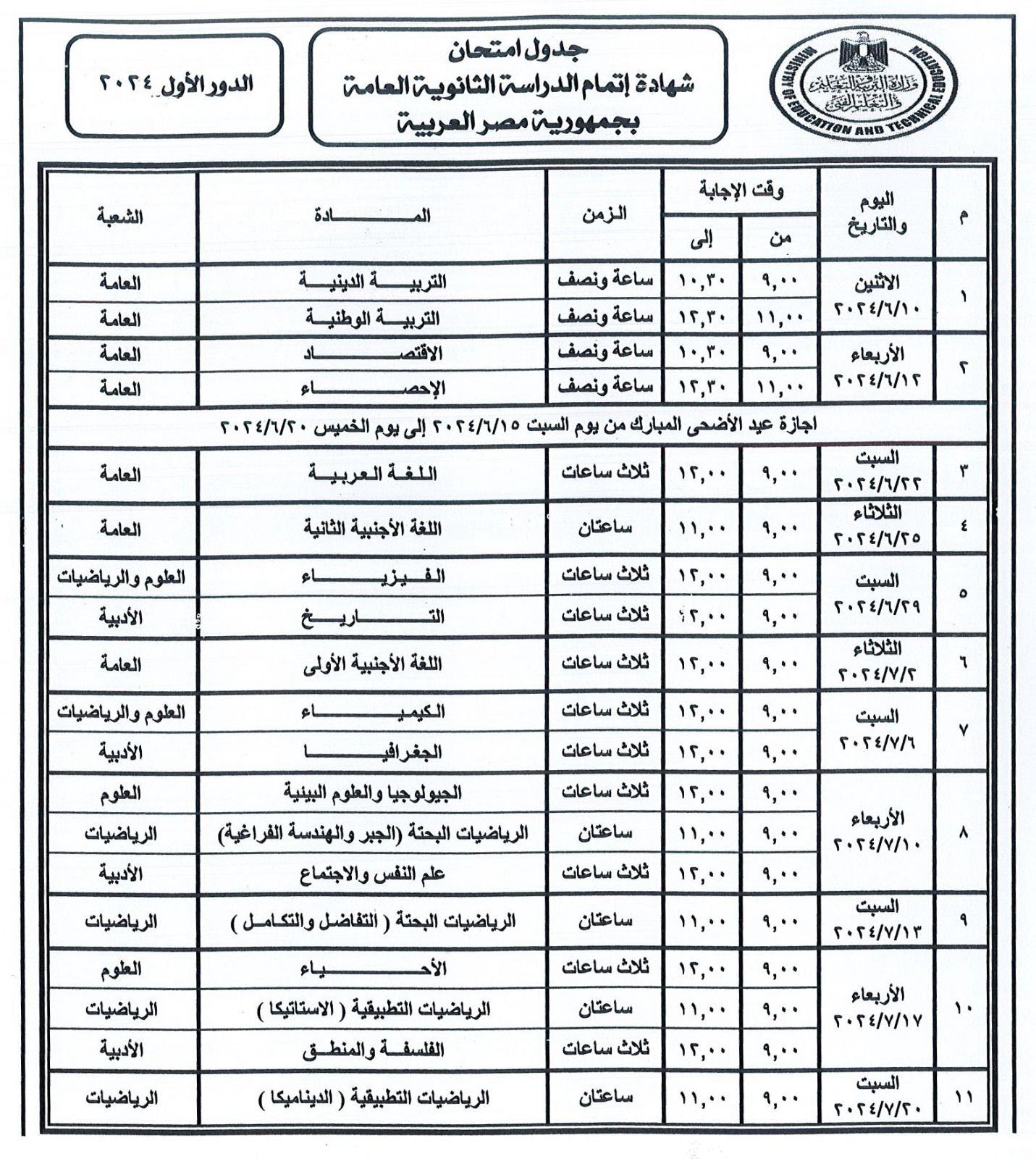 أعلنت وزارة التربية والتعليم، منذ قليل، جدول امتحانات الثانوية العامة بعد اعتماده من الدكتور رضا حجازي وزير التربية والتعليم والتعليم الفني.