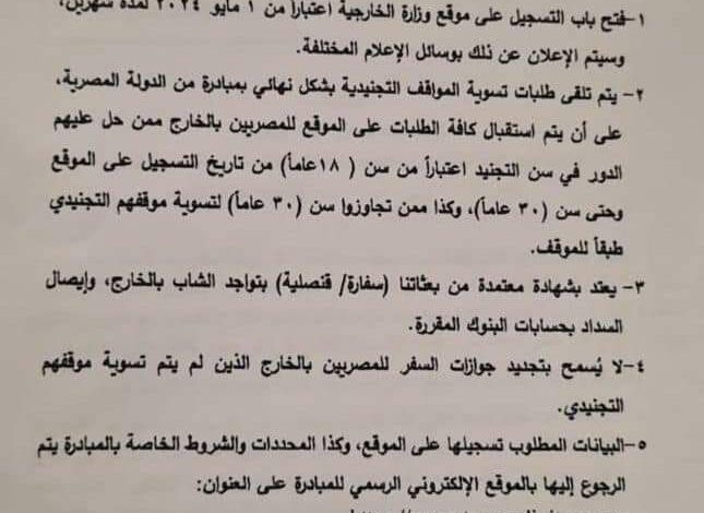 – تقرر إعادة إطلاق مبادرة تسوية الموقف التجنيدى للمصريين بالخارج وفقا للإعلان المرفق ، حيث سيتم فتح التسجيل بدء من 1 مايو 2024 ولمدة شهرين على الموقع الإلكترونى الرسمى للمبادرة
