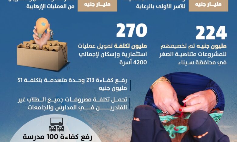 – 224 مليون جنيه تم تخصيصهم للمشروعات متناهية الصغر في محافظة سيناء.