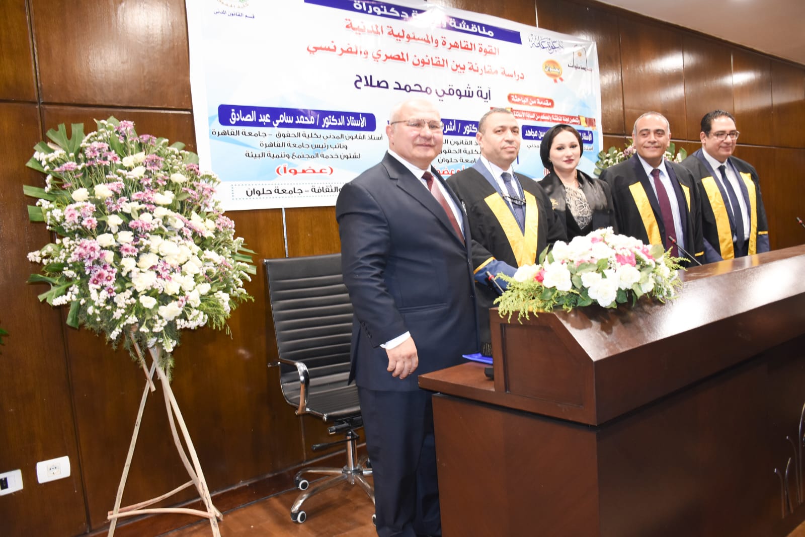 جرى مناقشة الرسالة بجامعة حلوان، التي كانت بعنوان ” القوة القاهرة والمسئولية المدنية – دراسة مقارنة بين القانون المصري والفرنسي “، حيث أوصت اللجنة بالتبادل وطباعتها على نفقة الجامعة.