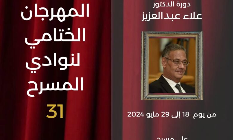 تنطلق السبت المقبل في السادسة مساء، على مسرح السامر بالعجوزة، فعاليات الدورة الحادية والثلاثين للمهرجان الختامي لنوادي المسرح، “دورة الكاتب المسرحي الراحل دكتور علاء عبد العزيز”، وذلك برعاية الدكتورة نيفين الكيلاني، وزير الثقافة، وتنظم الهيئة العامة لقصور الثقافة، برئاسة عمرو البسيوني، المهرجان في الفترة من 18 إلى 31 مايو الحالي، بمسرحي السامر وقصر ثقافة روض الفرج.