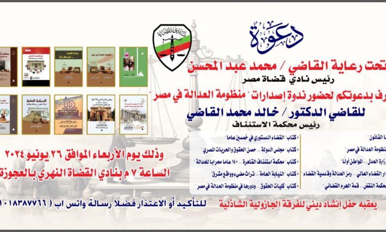 تحت رعاية القاضي محمد عبد المحسن، رئيس نادي قضاة مصر، يقام يوم الأربعاء 26 يونيو 2024 بنادي القضاة النهري بالعجوزة، احتفالية لإصدارات “منظومة العدالة في مصر” للقاضي الدكتور خالد القاضي، رئيس محكمة الاستئناف. تبدأ الاحتفالية في تمام الساعة 6:30 مساءً وتستمر حتى الساعة 10:00 مساءً.