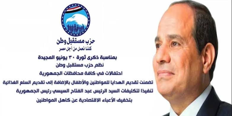 بمناسبة 30 يونيو.. «مستقبل وطن» ينظم احتفالات في مختلف المحافظات وتقديم الهدايا للمواطنين والأطفال
