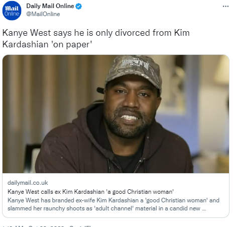 وفيما يواجه كانى ويست، حاليًا، عاصفة من الجدل بشأن التعليقات المعادية للسامية، قال: “قد أكون مطلق على الورق ولكني لست مطلق”، ولدى سؤاله عما إذا كان لا يزال يحبها، قال: “بالتأكيد، وسأحبها مدى الحياة، والغريب أنني سأحميها، سنكون دائمًا معًا، نعم لا يوجد شخص ستقابله يومًا ما سيؤثر عليها أكثر من الله ثم كاهنها على الأرض، والذي كان أنا.”