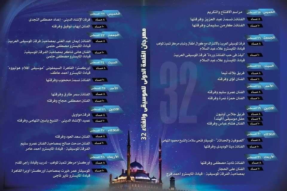 الدورة 32 من مهرجان القلعة الدولي للموسيقى والغناء والغناء تتواصل على مدار 14 يوما وتقام فى الفترة من الخميس 15 اغسطس حتى الأربعاء 28 أغسطس.
