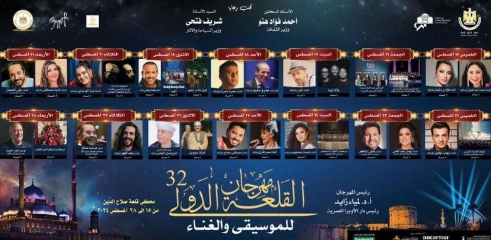 ينتظر الجمهور بشغف انطلاق الدورة 32 من مهرجان القلعة الدولي للموسيقى والغناء، والذى يقام على مسرح محكى قلعة صلاح الدين الأيوبي بمشاركة كبار نجوم الغناء والطرب من مصر والوطن العربي.