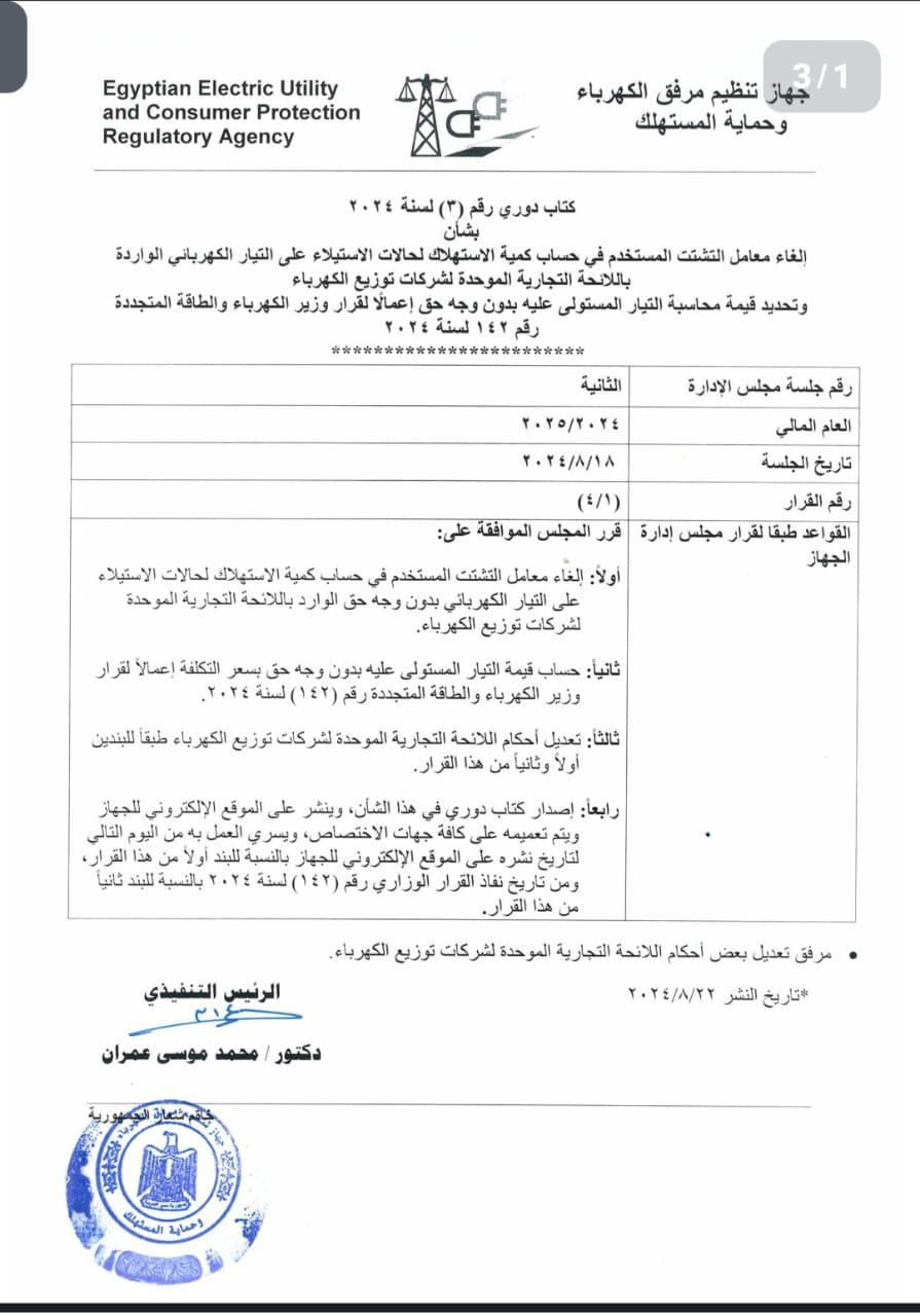 وأشار القرار الذي يحمل رقم 142 لسنة 2024 إلي انه سيتم حساب الاستهلاك بالعدادات الكودية بسعر موحد طوال الشهر وهو 214.5 قرش لكل كيلووات ساعة وهو سعر التكلفة.