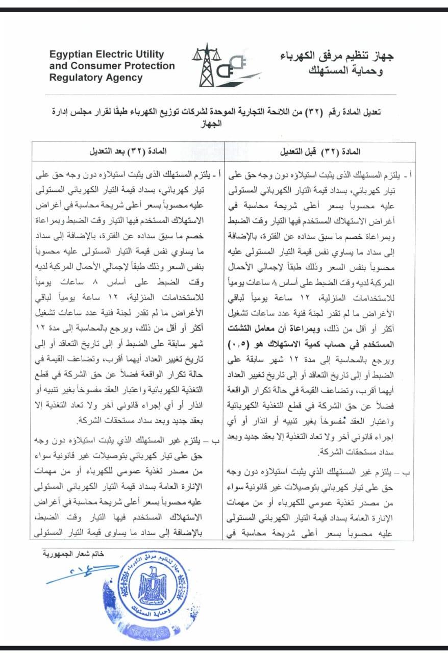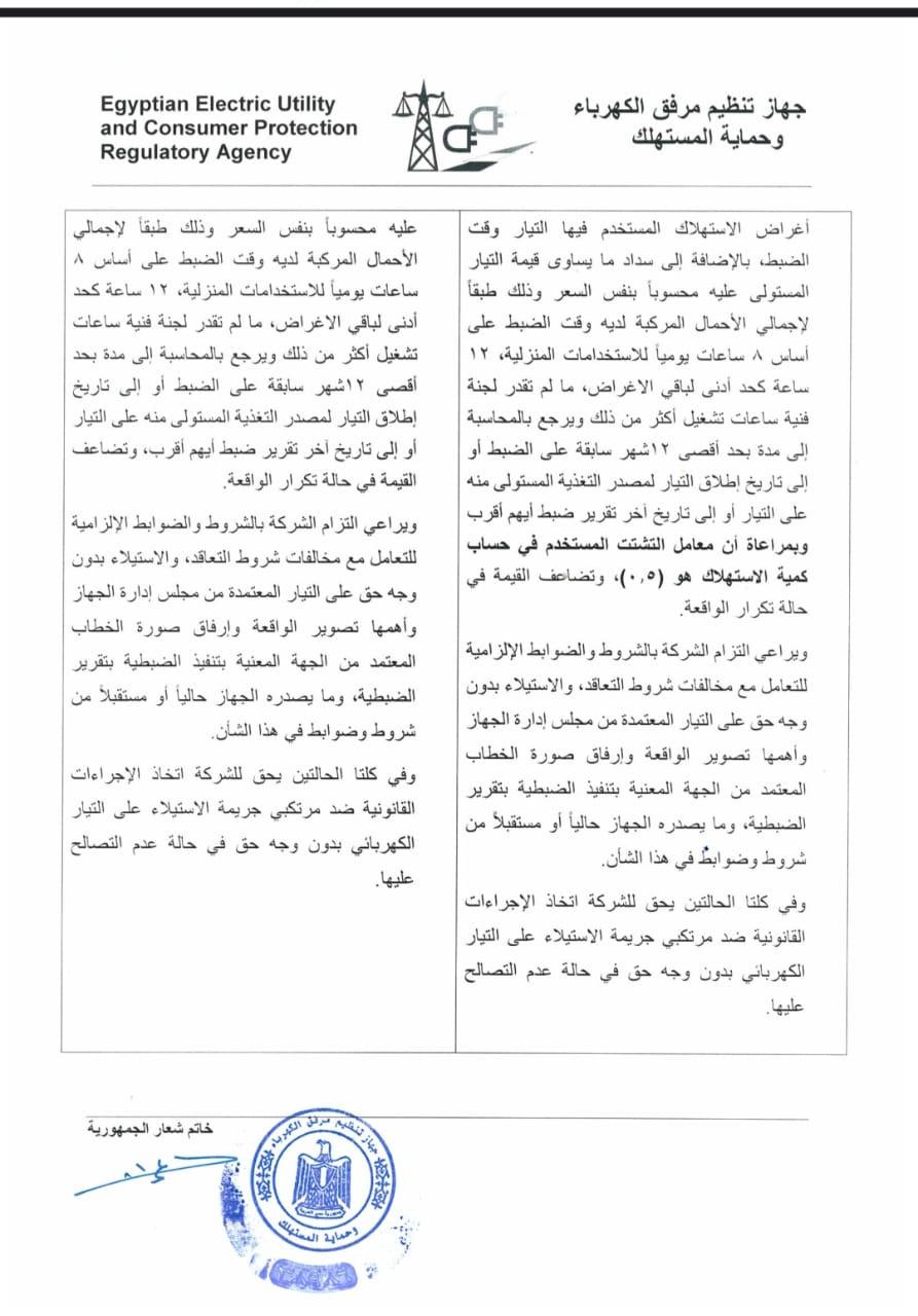 وافق جهاز تنظيم مرفق الكهرباء وحماية المستهلك، على اعتماد تعريفة المحاسبة على استهلاك الكهرباء المستولى عليها بدون وجه حق بسعر أعلى شريحة محاسبة في أغراض الاستهلاك المستخدم فيها التيار وقت الضبط على أساس 8 ساعات يوميا للاستخدامات المنزلية و12 ساعة كحد أدنى لباقي الأغراض ما لم تقدر لجنة فنية ساعات تشغيل أكثر.