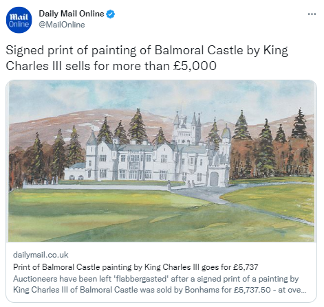 تُرك الباعة في مزاد “مندهشين” بعد بيع طبعة موقعة للوحة رسمها الملك تشارلز الثالث لقلعة بالمورال – بأكثر من 14 ضعف تقديرها الأصلى، حيث تم بيع النسخة المطبوعة “الساحرة” للرسم بالألوان المائية للملك في مزاد علني لهواة الجمع البريطاني الخاص اليوم مقابل 5737.50 جنيهًا إسترلينيًا، وفقًا لموقع “ديلى ميل”.