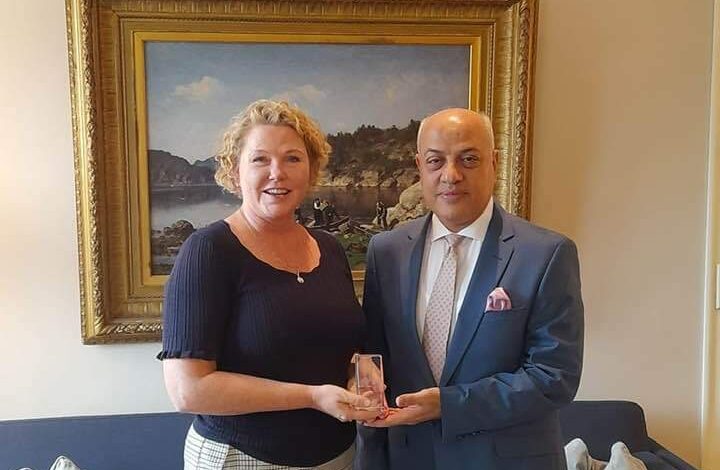 التقى الدكتور جمال عبد الرحيم متولي سفير مصر فى النرويج آن بيث تفينيريم وزيرة التنمية الدولية في مملكة النرويج، في إطار جهود تعزيز العلاقات الثنائية بين البلدين على مختلف الأصعدة.