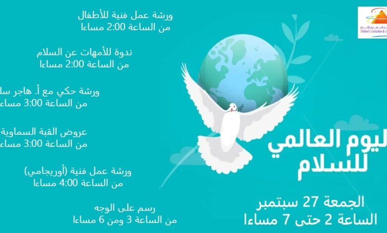 اعلن الدكتور نبيل حلمي رئيس مجلس إدارة جمعية مصر الجديدة ان مركز الطفل للحضارة والإبداع (متحف الطفل) ينظم اليوم الجمعة في الساعة الواحدة ظهرا عدد من الأنشطة والفعاليات للزوار بالتعاون مع الإدارة المركزية لثقافة الطفل برئاسة دكتوره جيهان حسن وذلك إحتفالاً باليوم العالمي للسلام والذي يحمل هذا العام شعار دولياً بعنوان “زرع ثقافة السلام” ؛ كما يصادف هذا العام الذكرى ال25 لاعتماد الجمعية العامة للأمم المتحدة إعلان وبرنامج عمل بشأن ثقافة السلام ؛ حيث تقدم ندوة للأمهات بعنوان “التربية الايجابية والتنشئة الصحيحة رؤي لبداية جديدة” ؛ كما يشمل الاحتفال ورش عمل فنية للأطفال، ورشة حكي تقدمها الكاتبة هاجر سلامة ورشة فنية (أوريجامي) إلي جانب عروض القبة السماوية.