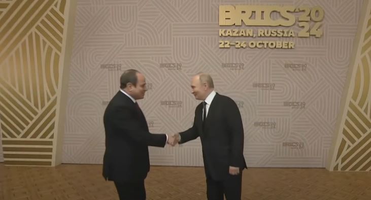 أعرب الرئيس عبدالفتاح السيسي، عن سعادته بلقاء الرئيس الروسي فلاديمير بوتين، على هامش قمة تجمع «بريكس»، والتقدير الكبير لدعم موسكو لانضمام مصر إلى التجمع، والجهد المقدر الذي بذلته روسيا طوال فترة رئاستها للتجمع.