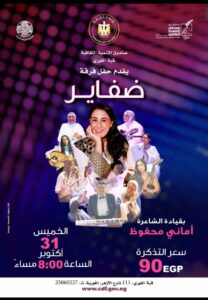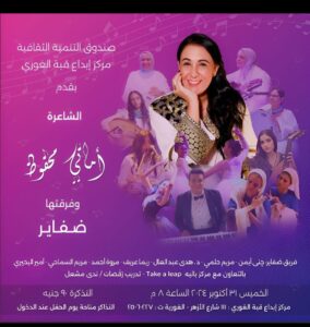 تقيم الشاعرة أماني محفوظ حفلها الشعري الموسيقي الاستعراضي الجديد بمركز إبداع قبة الغوري في الثامنة مساء غد الخميس بصحبة فرقتها ضفاير..