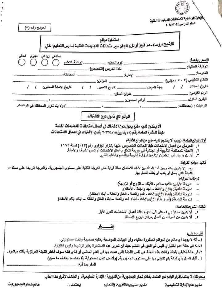 – قيام جميع المرشحين بتحرير استمارة الموانع وتراجع البيانات والأختام بالإدارة التعليمية والمديرية مع صحيفة الأحوال ثم تقوم المديرية بإيفاد مندوب بتفويض معتمد من طرفها بهذه الموانع وصحائف الأحوال مجمعة لكل مدرسة على حده على مستوى المديرية التعليمية، ولكل نوعية من نوعيات التعليم الفني، وذلك لتسليمها إلى لجنة الإدارة المركزية لامتحانات الدبلومات الفنية قبل نهاية شهر ديسمبر ٠2024