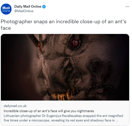 التقط مصور صورًا مقربة لا تصدق لوجه نملة مكبر خمس مرات تحت المجهر، كاشفًا عن عيونها الحمراء ووجهها الغامض بتفاصيل استثنائية، وتم إرسال الصورة إلى مسابقة Nikon Small World Photomicrography وتم اختيارها كواحدة من 57 “صورة متميزة”، وفقًا لموقع “ديلى ميل”.