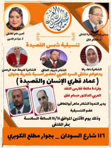 تنسيقية شمس القصيدة هذا الكيان الذي بدأ عملاقًا واستمر بخطى ثابتة نحو القمة والذي يتشرف بكوكبة من كبار شعراء مصر المهندس المحترم تؤام الروح الشاعر شريف العاقل وزاد البهاء بالدكتورة الموقرة فارسة الفصحى دعاء رخا واكتمل عقد الجمال ببنت الجزائر الحُرة الشاعرة فتيحة عبد الرحمن بقة واجتمع كل هؤلاء تحت مظلة عملاقة بقائدها المغوار فارس النقد العربي معالي الدكتور الموقر حسام عقل والأمين العام الدينامو الكاتبة عزة عز الدين. .