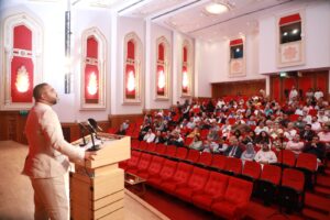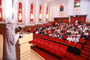 ثم قرأ نصا تغنى فيه بمكارم الرسول صلى الله عليه وسلم، ورسم في طياته نهرا من الكلمات الصادقة التي حاول من خلالها شرح عاطفته القوية واحتمائه بهدي النبي، ومما جاء فيها: