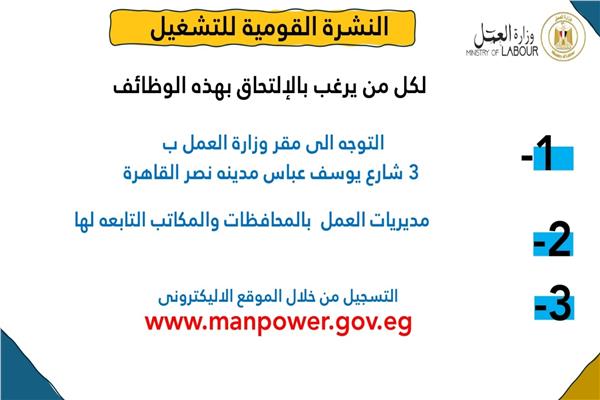 وذكرت “الوزارة” أن التقديم على هذه “الفرص الجديدة” خلال شهر ديسمبر 2024 الجاري ، عن طريق مكتب الإدارة العامة للتشغيل بمقر “الوزارة” القديم بمدينة نصر،أو مديريات العمل بالمحافظات، أو أرقام وعناوين الشركات المُرفقة مع هذا البيان،وكذلك على الموقع الرسمي لوزارة العمل على “الإنترنت”.
