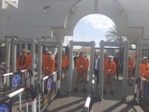 وتنتشر بوابات التفتيش المتطورة للأطقم الأمنية للمجموعة الافريقية لتأمين دخول الجماهير، بينما تراقب غرفة العمليات كل تفاصيل المباراة، على مدار الساعة، لضمان سيرها في أجواء آمنة بعيداً عن أي ممارسات قد تؤثر على مجرياتها، مثل الشماريخ التي تحظر تماماً.
