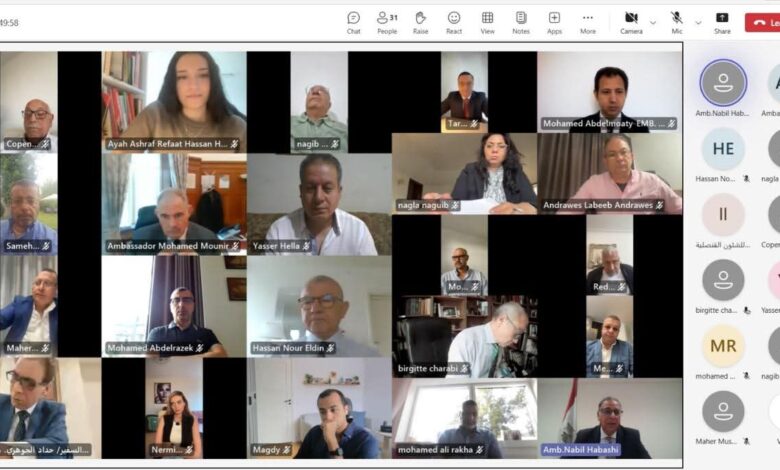 عقد السفير نبيل حبشي نائب وزير الخارجية والهجرة وشئون المصريين في الخارج لقاءً افتراضيا ًمع الجالية المصرية في كل من الدنمارك والسويد يوم الأحد ٢١ سبتمبر ٢٠٢٥، وذلك بحضور السفير حداد الجوهري مساعد وزير الخارجية للشئون القنصلية والمصريين في الخارج، والسفير محمد منير لطفي سفير جمهورية مصر العربية في الدنمارك، والسفيرة نجلاء نجيب سفير جمهورية مصر العربية في السويد.