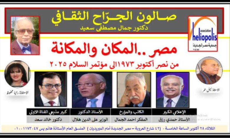 تنطلق بمكتبة مصر الجديدة العامة ، فى الساعة السادسة من عصر بعد غد الثلاثاء ، فعاليات صالون الجراح الثقافى الشهرى والذي يعقد هذا الشهر بعنوان مصر المكان والمكانة من نصر اكتوبر ١٩٧٣ حتى مؤتمر السلام ٢٠٢٥ ، وذلك برعاية جمعية مصر الجديدة برئاسة الدكتورة سهام الجوهرى رئيس الجمعية وصالون الجراح الثقافى برئاسة الدكتور جمال مصطفى سعيد، بمشاركه لفيف من المثقفين والسياسيين منهم الاعلامى الكبير حمدي رزق و المؤرخ والمفكر الكبير احمد الجمال الدكتور الوزير علي الدين هلال كبير مذيعي القناه الاولى دكتور خالد سعيد الاستاذه رانيا محفوظ الاستاذ نبيل عمر