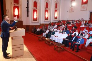 ثم قرأ قصيدة أسماها “فرح يحدث نفسه” معبراً عن فرحه بولادة نص روحي، يسرد فيه سيرة عطرة أضاءت الكون ببهائها وذكرها ونورها، وقال: