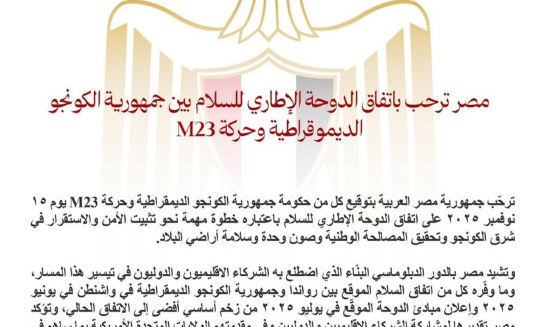 رحبت مصر بتوقيع حكومة جمهورية الكونجو الديمقراطية وحركة M23 يوم 15 نوفمبر 2025 على اتفاق الدوحة الإطاري للسلام باعتباره خطوة مهمة نحو تثبيت الأمن والاستقرار في شرق الكونجو وتحقيق المصالحة الوطنية وصون وحدة وسلامة أراضي البلاد