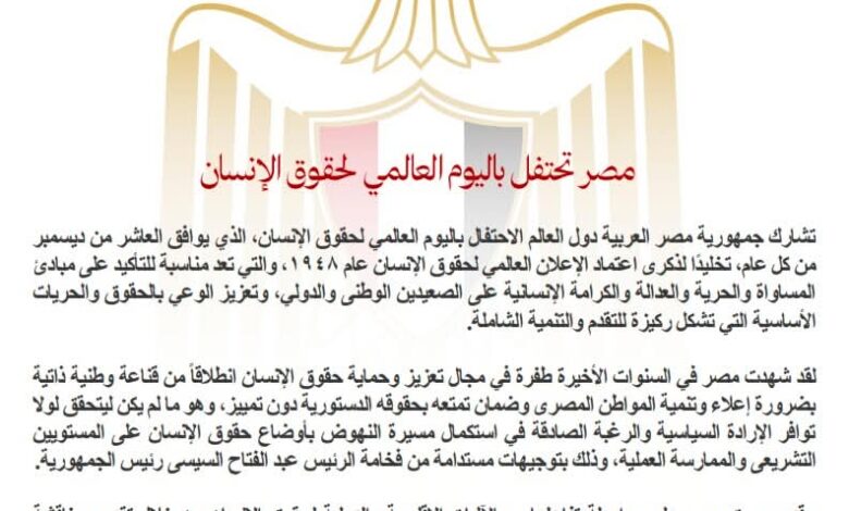 اكدت وزارة الخارجية فى بيان لها ان مصر تشارك دول العالم الإحتفال باليوم العالمي لحقوق الإنسان الذي يوافق العاشر من ديسمبر من كل عام، تخليدًا لذكرى إعتماد الإعلان العالمي لحقوق الإنسان عام 1948 ،وتعد المناسبة اللتأكيد على مبادئ المساواة والحرية والعدالة والكرامة الإنسانية على الصعيدين الوطني والدولي، وتعزيز الوعي بالحقوق والحريات الأساسية التي تشكل ركيزة للتقدم والتنمية الشاملة