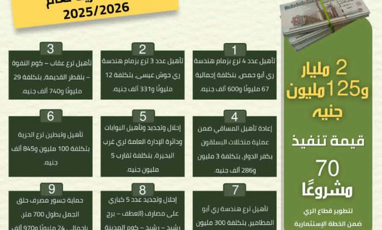 البحيرة تنفذ 70 مشروعا لتطوير الري بتكلفة 2.125 مليار جنيه لدعم الزراعة والمزارعين