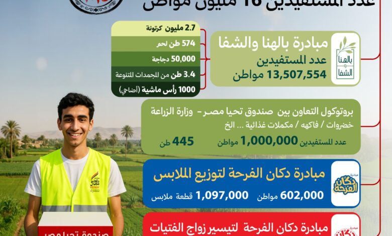 • تمكنت معارض “دكان الفرحة” من إحداث طفرةٍ إنسانيةٍ ملموسةٍ عبر توفير الملابس الجديدة، والأحذية، والإكسسوارات، والمفروشات، وصولاً إلى ألعاب الأطفال والمستلزمات المدرسية؛ و أتاحت المبادرة الفرصة للأسر المستحقة لاختيار احتياجاتها بحريةٍ تامةٍ كهديةٍ من صندوق تحيا مصر، مع تخصيص 15 قطعةً لكل أسرة تلبي تطلعاتها وتناسب أذواق أفرادها.