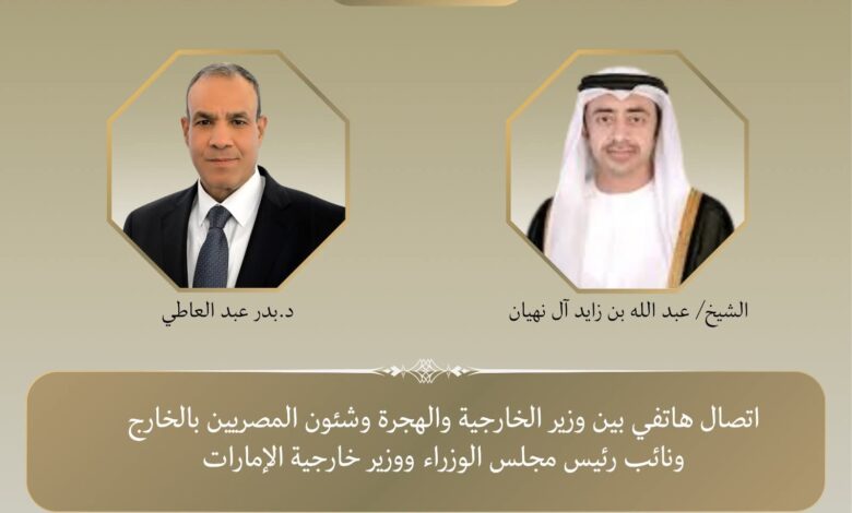 جرى اتصال هاتفي بين دكتور بدر عبد العاطي وزير الخارجية والهجرة وشئون المصريين بالخارج، الشيخ عبد الله بن زايد آل نهيان نائب رئيس مجلس الوزراء ووزير الخارجية بدولة الإمارات العربية المتحدة الشقيقة، وذلك في إطار التشاور والتنسيق المستمر بين البلدين الشقيقين إزاء سبل دعم العلاقات الثنائية، وبحث عدد من القضايا الإقليمية ذات الاهتمام المشترك.