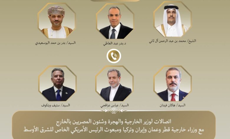 أجرى دكتور بدر عبد العاطي وزير الخارجية والهجرة وشئون المصريين بالخارج اتصالات مكثفة بكلٍ من “عباس عراقجي” وزير خارجية إيران، و “ستيف ويتكوف” المبعوث الأمريكي الخاص للشرق الأوسط، والشيخ “محمد بن عبد الرحمن”، رئيس وزراء ووزير خارجية قطر، و “هاكان فيدان”، وزير خارجية تركيا، و “بدر بن حمد البوسعيدي”، وزير خارجية سلطنة عمان، في إطار تنفيذ توجيهات رئيس الجمهورية بخفض التصعيد في منطقة الشرق الأوسط