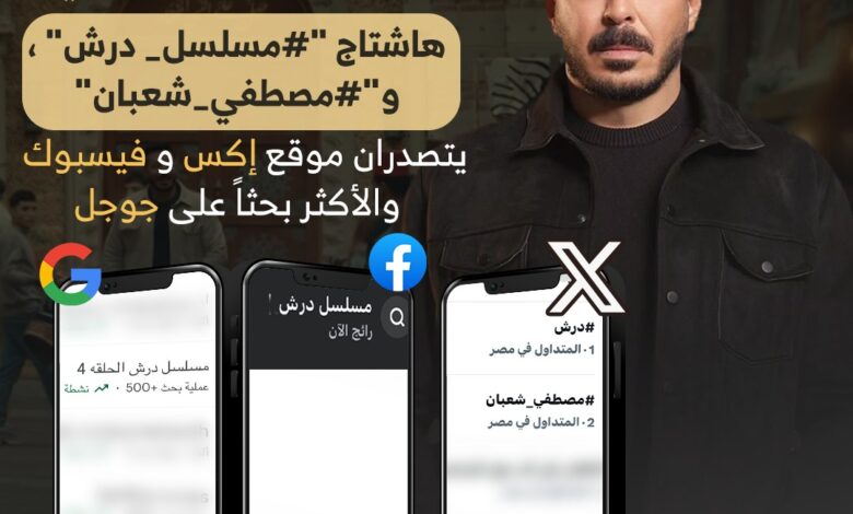 لليوم الرابع على التوالي، تصدر هاشتاج “#مسلسل_درش” و” #مصطفي_شعبان” تريند موقع إكس وفيسبوك، والأكثر بحثًا على جوجل بعد عرض الحلقة الرابعة من المسلسل.