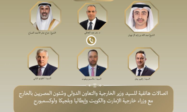 أجرى الدكتور در عبد العاطي وزير الخارجية والتعاون الدولي والمصريين بالخارج، اتصالات مكثفة مع عبد الله بن زايد نائب رئيس مجلس الوزراء ووزير خارجية دولة الإمارات العربية المتحدة الشقيقة، و الشيخ جراح جابر الأحمد الصباح وزير خارجية دولة الكويت الشقيقة، و “أنطونيو تاياني” نائب رئيس الوزراء وزير خارجية إيطاليا، و “مكسيم بريفوت” نائب رئيس الوزراء ووزير خارجية بلجيكا، و “زافيير بيتل” نائب ئيس الوزراء ووزير خارجية لوكسمبورج، مساء يوم الأحد ٨ مارس، وذلك لتناول التطورات الإقليمية وبحث سبل خفض التصعيد وحدة التوتر فى المنطقة.