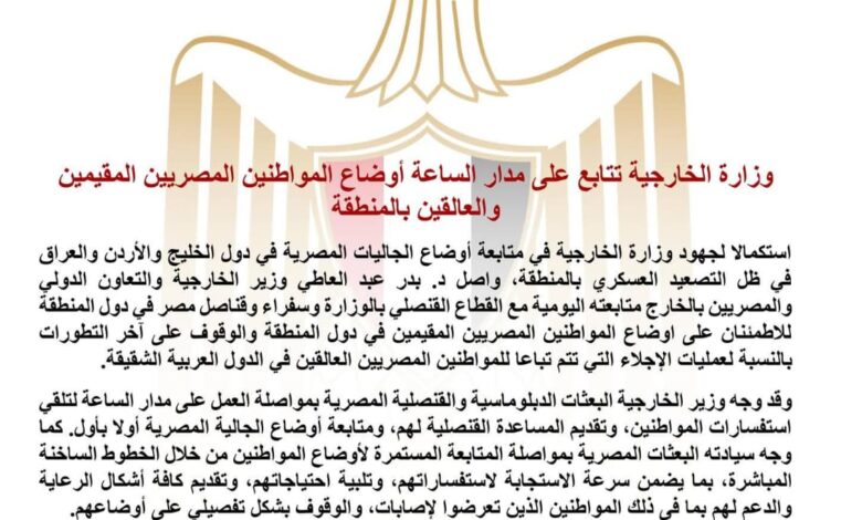 يتابع الدكتور بدر عبد العاطي وزير الخارجية والتعاون الدولي والمصريين بالخارج مع القطاع القنصلي بالوزارة وسفراء وقناصل مصر في دول المنطقة للاطمئنان على اوضاع المواطنين المصريين المقيمين في دول المنطقة والوقوف على آخر التطورات بالنسبة لعمليات الإجلاء التي تتم تباعاً للمواطنين المصريين العالقين في الدول العربية الشقيقة.