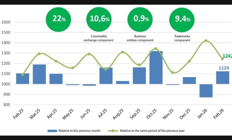 بلغ مؤشر النشاط التجاري، الذي يُقدّره مركز البحوث الاقتصادية والإصلاحات، 1124 نقطة في فبراير 2026، مسجلاً ارتفاعًا بنسبة 12.4% مقارنةً بالشهر السابق
