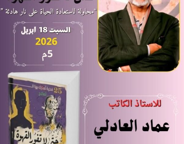 حفل توقيع ومناقشة كتاب على نار هادئة لعماد العادلى في الساعة السادسة من مساء غد السبت فى مكتبة مصر الجديدة.