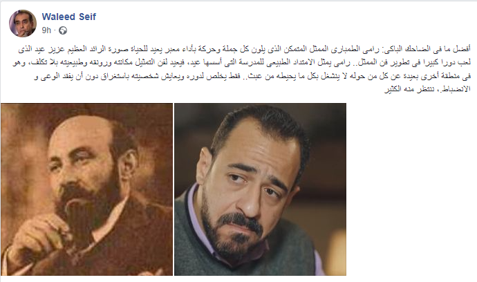 أشاد الناقد وليد سيف بأداء الممثل رامي الطمباري في مسلسل ” الضاحك الباكي ” الذي يعرض حاليا على قناة cbc وcbc دراما، ويجسد فيه شخصية الفنان الراحل عزيز عيد.