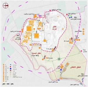 • نطاق التراث .. ويضم الآثار الظاهرة والمناطق الخاضعة للتنقيب الأثري المحتملة ،بالإضافة إلى مناطق البيئة الطبيعية وهو نطاق خالي من أي عناصر أخرى